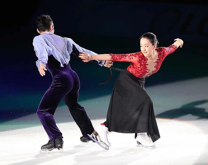 Шоу было как посвящение Мао и её карьере. Всё крутилось вокруг неё, её программ и т.д. Начали с группового номера урока балета. Потом переоделись все в красное и чёрное а ля Стендаль и пошли Ritual dance плясать. Аделя там ярче всех смотрелась (спасибо "Танцам с звёздами"), этакая готическая принцесса-вампирща с огненными глазами. Из элементов, Дай и Мура 3Л прыгнули, Шома- климкин угол прокатил. Открывала сольные номера Маи Асада, с чёрным лебедем, 2А со степаутом и в самом худшем костюме оного лебедя в истории фк. Козука сделал 1А, 3Т, 2А, но главное- форму он конечно подрастерял именно в скейтинг скилз, его сильнейший момент. Едет медленно, больше себя любимого во времена молодости вспоминает. Вполне логичный исход для того, кто так долго на каток не ходил. Мираи представила типичнейшую северо-американскую прогу с расчётом на публику из дураков. Смесь из танцев стриптизёрш и бродвея, потряси хвостом, плечиками, задом и чаевые в кармане. Она на триксель шла, он мне поначалу даже дупелем показался, чего это думаю публика так перевозбудилась. А ответ прост, формально триксель вроде как любят, раз ультра-си у девочек. А дефакто, настоящий триксель никогда двойным не покажется. Зато за триксель можно выдать перекрученный дупель, на выходе- летишь попой вперёд, а приземляешься не на ход, т.е. докручивать на льду надо. Хотя 3Л и 3Т у неё были хорошие и высокие, именно прыжки, а не твизлы-крутко-заспиновичи. Тонги катали Moon river, двойная подкрутка, она упала с выброса. Они всё таже красивая романтичная пара, по-прежнему влюблённая друг в друга. Мура шёл на квад, который сильно сдаунгрейдил и плохо упал на спину. Триксель тоже на пять галок и две ноги, сделал 3Л. В новой проги он выглядит более гармонично, вот пусть и катает под мужской вокал, чем всякие цирки дю солей. Канако- 3Т, 3С под попсовую женскую лирику, с розой и драмой на лице. А вот потом был один из хайлайтов шоу- поппури из программ Мао. Открывала Аделина с "Шахерезадой", за ней Ода, Шома, Акико, Пожики, Баттл, Козука, Тонги, Дай под туриновского Раха и сама Мао с уникальной дорожкой из её последней ПП. В антракте было ток-шоу с участием Мао и Дая, где они в воспоминания вдарились.