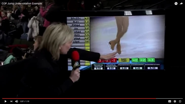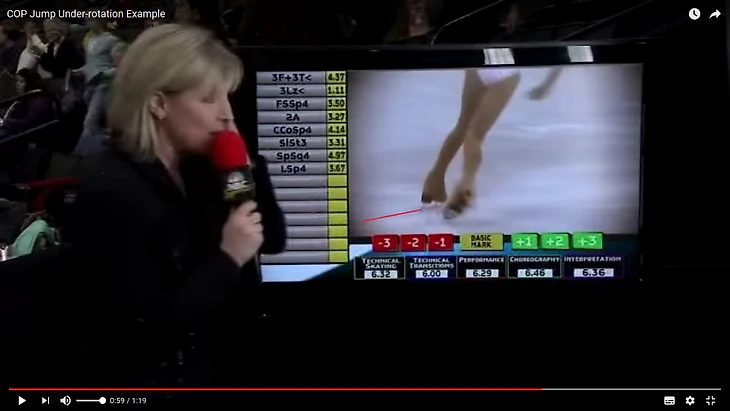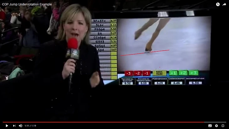 Особенно обращаю ваше внимание на её слова с 49 секунды: "Тройной лутц было намного сложнее заметить, поэтому посмотрите внимательнее: она толкается здесь правой ногой, но не набирает достаточно высоты в воздухе, чтобы докрутить прыжок. Теперь посмотрите на момент, когда она приземляется, и сфокусируйтесь на зубцах правого конька. Вы видите: носок в этот момент (приземления) направлен на нас, затем происходит «доворот» на льду. Этот прыжок был признан недокрученным. Она потеряла на нём 5 баллов".