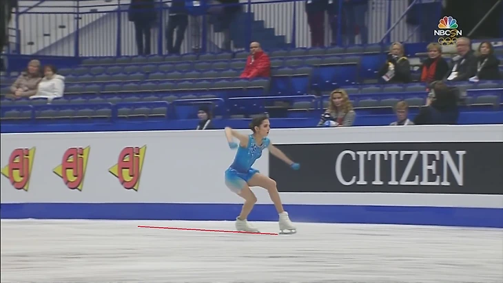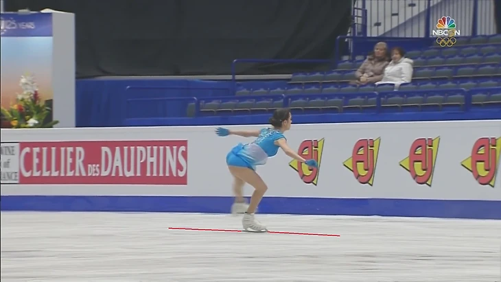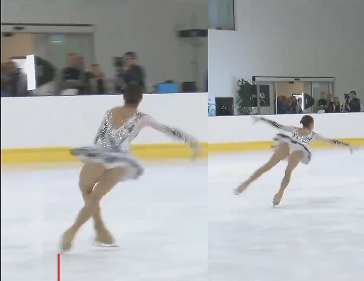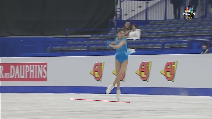 На кадре слева чётко видно, что левая нога даже близко не отведена назад, а упор на ребро ещё не сделан. Это уже косвенные признаки позы не вышедшей из фазы прыжка фигуристки. А ведь, как мы помним, линия выезда = линии начала прыжка.