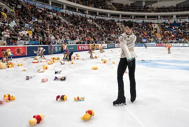 Да, вот такое необычное и чудесное явление мы увидели на российском льду. Да оно и понятно, Юзуру Ханью сам по себе является фигурнокатательным чудом, и потому подогрел интерес болельщиков к этапу, сподвиг их наконец прийти и вживую насладиться тем, какую магию он творит на льду. Кстати, попасть на относительно хорошие места было проблемотично еще за несколько месяцев до старта, ибо преданные японские поклонники Юзуру скупили все самые выгодные точки обзора практически сразу. Был ли олимпийский чемпион на высоте? Нет, что вполне можно объяснить началом сезона. Заворожил ли зрителей? Бесспорно.От большинства тех, кто был в те дни в ледовом дворце, я слышала восхищенные отзывы от самой атмосферы, которую Ханью создает на льду. А уж такого дождя из Винни-Пухов Москва вообще еще видела. Это действительно впечатлает не меньше, чем само катание великого японца. Интересно, а Юзуру знает про советского Винни? Мне кажется, он не хуже. Ну а пока наслаждаемся горами диснеевского мишки.