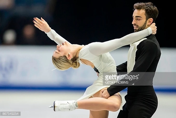 Хавайек и Бейкер оставили прошлогодний танец "Грёзы любви". Нежно и утонченно. Платье Кейтлин создавало ощущение полета надо льдом. Градиентик симпатичный, пусть и мейнстримный. Но что это за подмигивания у Хавайек перед началом проката?