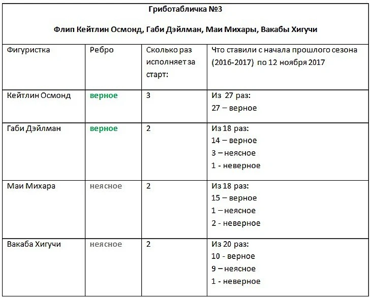 И опять мы переходим к тому моменту, что техпанель начинает выдумывать неверные ребра там, где их нет. А иногда Маи Михаре и ставят неверное (внешнее) ребро на флипе, например, это было на турнире Autumn Classic 2017, где он соперничала с Кейтлин Осмонд. Видимо, чтобы обеспечить канадке первое место, японке нарисовали лип и в короткой программе и в произвольной, хотя никаким липом там и не пахнет.