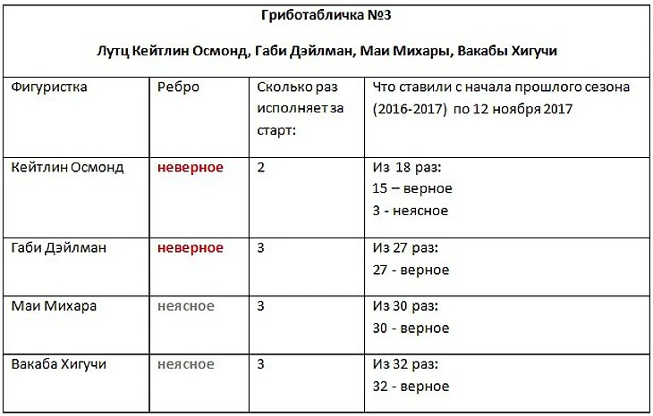 Выяснилось, что у некоторых фигуристок техническая панель вообще не отмечает (почти никогда) неверные ребра, более того, иногда верные ребра фиксирует, как неверные. Давайте разберем эти наиболее вопиющие 4 случая:
