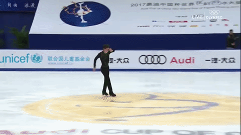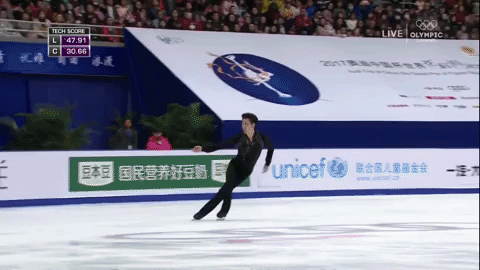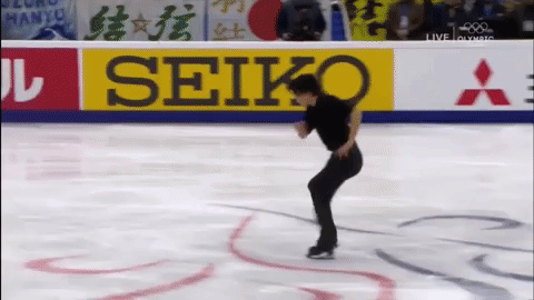 Короткая программа https://youtu.be/2ysbCF_Jf10 Патрика Чана начинается с красивой серии простых коньковых связок (подсечка, перетяжка, кросс ролл, перетяжка) и проездки с выпадом на левую ногу. Далее фигурист исполняет переход на ход вперед, пару беговых, перекидной, подсечку с переходом на ход вперед и два беговых шага перед заходом на первый прыжковый элемент - каскад 4Т+3Т. Каскад исполняется с привычного для Патрика захода: тройки после обманного шага с переходом на ход вперед. После выезда с каскада - комбинированная связка: тройка, шассе, тройка, бести на внутренних ребрах с переходом на дугу назад наружу, подпрыжка, подсечка, крюк, выкрюк (гиф 1). Сразу после этой серии связующих шагов и поворотов - пара подсечек и заход на сольный 3Lz: моухок-крюк-чоктау-шассе-моухок-подсечка. Все шаги на заходе исполнены без разрывов (пауз) в одном ритме с последним шагом, с которого исполнен прыжок. После подпрыжки на выезде с прыжка - заход на вращение в либеле со сменой ноги. Тройка на выезде с прыжка, провозка с движениями тела (body movement transition), серия подсечек и шассе, переход на ход вперед, моухок-подставил вторую ногу-переход на ход вперед - 3А (ставший для Патрика традиционным заход на тройной аксель без усложнений). После выезда с прыжка фигурист исполняет дорожку шагов и завершает программу двумя вращениями - волчком и комбинированным со сменой ноги, между которыми исполняет переход из связующих шагов и элементов (гиф 2): подсечка, моухок, широкий шаг, тройка, подпрыжка с переходом в выпад и проезд в выпаде.