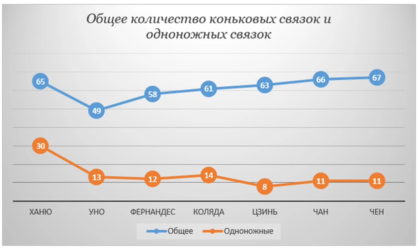 Общее количество связующих шагов и поворотов (footwork movement transition), исполняемых за единицу времени и характеризующих плотность связок, а также соотношение общего количества коньковых связок к количеству одноножных связок представлено на графике ниже.