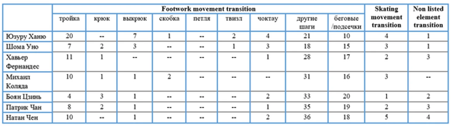 Мы рассмотрели использование связующих шагов, движений и элементов (footwork transition, skating movement transition и non listed element transition) в программах топ-7. Последняя составляющая критерия разнообразие компонента TR - связующие движения тела в различных сочетаниях - голова, руки и торс (body movement transition).