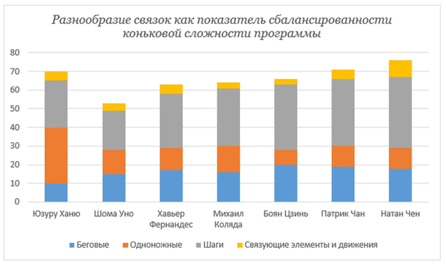 Данные графика, таблицы и диаграммы позволяют оценить сбалансированность программ по разнообразию и сложности коньковых связок.