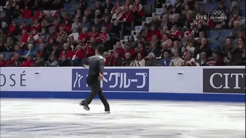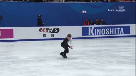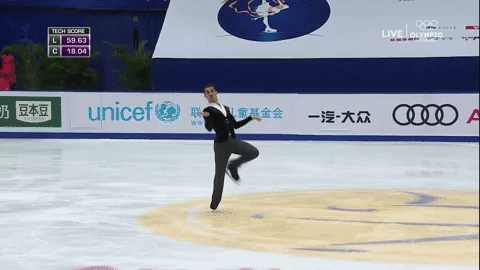 Михаил Коляда начинает короткую программу https://youtu.be/qBAEfRk35OQ с позировки (body movement transition), переходящей в коньковую связку с движениями корпуса и рук (гиф 1): тройка, шассе, тройка, дуга назад наружу, тройка, моухок. Далее переход на ход вперед, три подсечки и заход на сольный прыжок - 4Lz: тройка-подставил вторую ногу-моухок-подсечка. По этому поводу у меня противоречивые чувства. С одной стороны, Михаил - единственный фигурист, исполняющий сольный 4Lz в КП. Его прыжок - один из самых техничных и эффектных (впечатляющих), когда-либо увиденных мною вживую и безусловно заслуживающий высоких надбавок за качество исполнения. С другой стороны - требование о наличии обязательных шагов перед сольным прыжком в КП, которое необходимо исполнять. Непосредственно перед прыжком исполнены моухок и подсечка, что выглядит несолидно для такого технически сильного фигуриста как Михаил. Поэтому хотелось бы видеть перед моухоком более насыщенный (интересный) заход. Сразу после выезда с прыжка - переход на ход вперед и коньковая связка из простых шагов и сложных поворотов: крюк, выкрюк, беговой шаг, дуга вперед наружу, скобка (гиф 2). Далее Михаил переходит на ход вперед, исполняет моухок и серию подсечек перед заходом на каскад 4Т+3Т: моухок-широкий шаг-моухок-шассе-переход на ход вперед-тройка. После выезда с каскада переход к вращению в волчке. Далее связующие движения тела (позировка), выпад, серия моухоков и подсечек перед заходом на 3А, который исполняется со сложного захода (скобка с переходом на ход вперед) и с сложным выездом (тройка-кораблик). После тройного акселя фигурист переходит к исполнению вращения в либеле со сменой ноги, сразу после которого выполняет дорожку шагов и финальное комбинированное вращение.