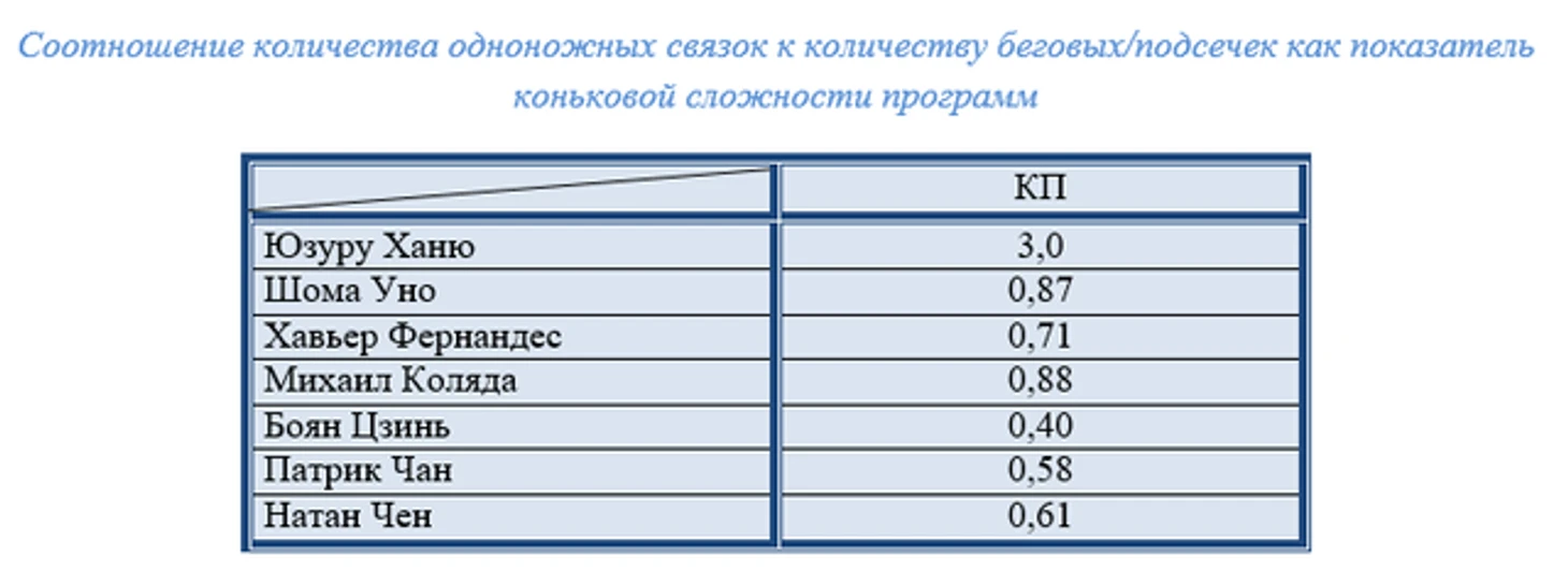 В таблице 2 и на диаграмме 2 представлена качественная характеристика сложности коньковых связок в коротких программах топ-7 как соотношение количества одноножных связок к количеству беговых/подсечек. Почему именно их? Потому что одноножные связки гораздо сложнее. Подсечки и беговые - это простейшие базовые шаги и в программах фигуристов топ-уровня должны использоваться в основном в качестве вспомогательных шагов (в "служебных" целях) при наборе скорости перед заходами на прыжковые элементы. Способность набрать скорость с минимального количества беговых/подсечек и удержать ее при исполнении сложных коньковых связок означает, что фигурист катается гораздо эффективнее и с лучшим контролем. Именно это называется мастерством и заслуживает поощрения. Напротив, исполнение большого количества подсечек, какими бы "выразительными и гениальными"(c) они не были и двуножное катание вместо разнообразных коньковых связок не соответствует сразу двум критериям компонента TR (разнообразие и сложность) и не дает никаких оснований для дополнительных плюшек и бонусов при оценивании анализируемого компонента.