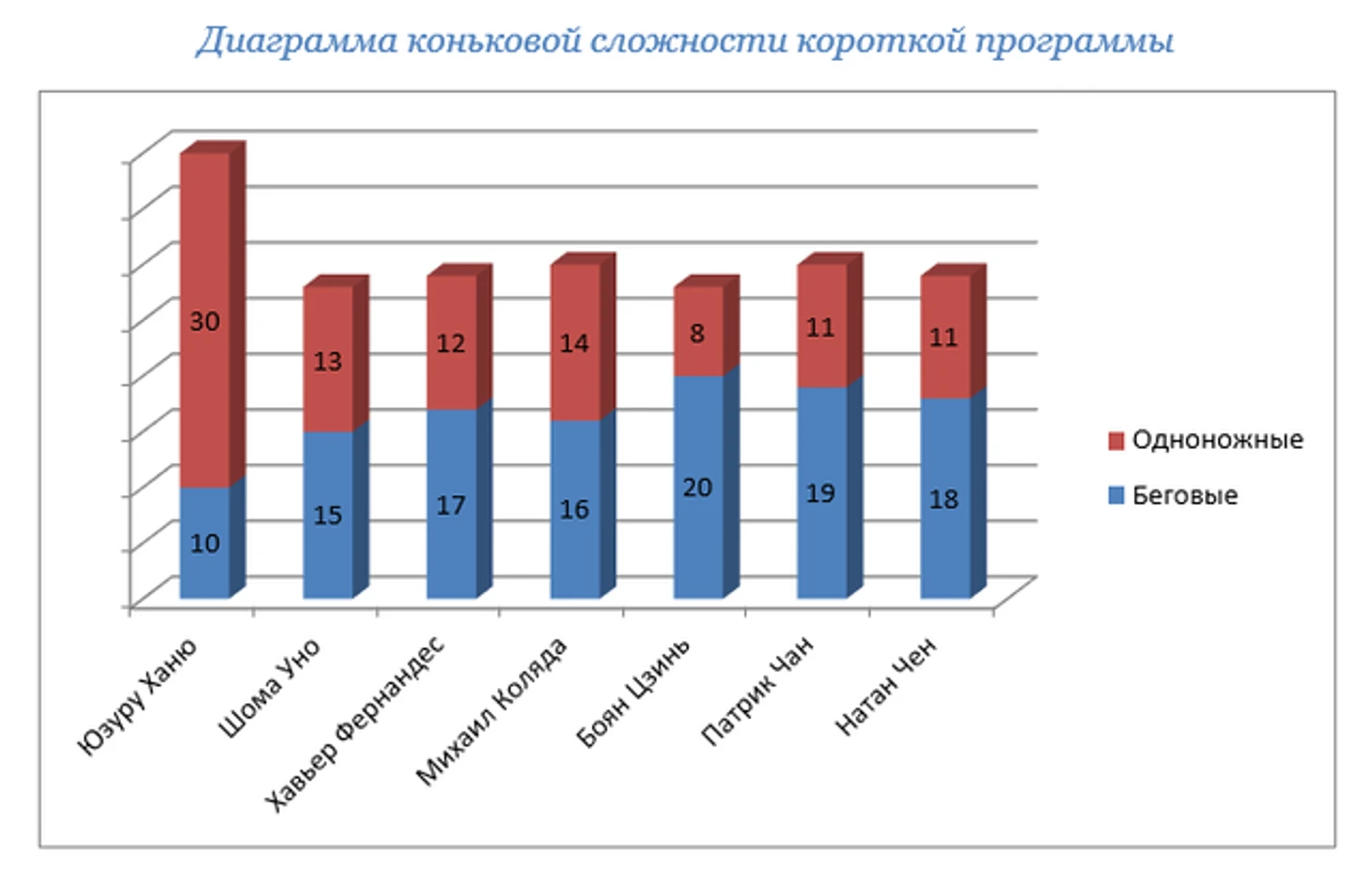 Очевидно, что самой сбалансированной по этому показателю программой является короткая программа Юзуру Ханю. Превалируют коньковые связки, минимальное количество беговых/подсечек на фоне других типов коньковых связок. Используются преимущественно одноножные коньковые связки, о чем свидетельствует количественное соотношение поворотов и шагов на диаграмме. В качестве связующих элементов и движений используются три кораблика, бауэр и ойлер.