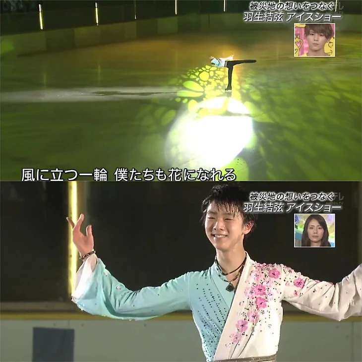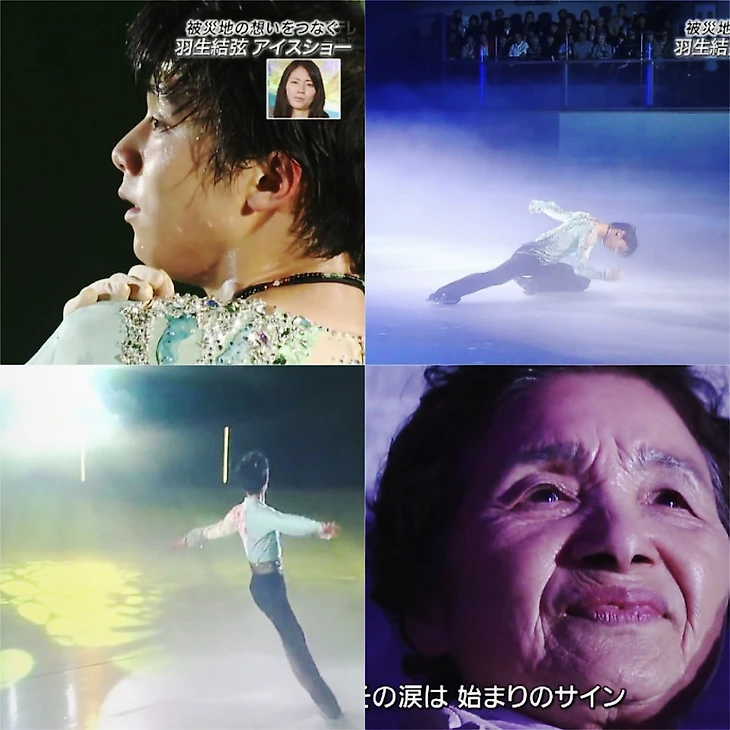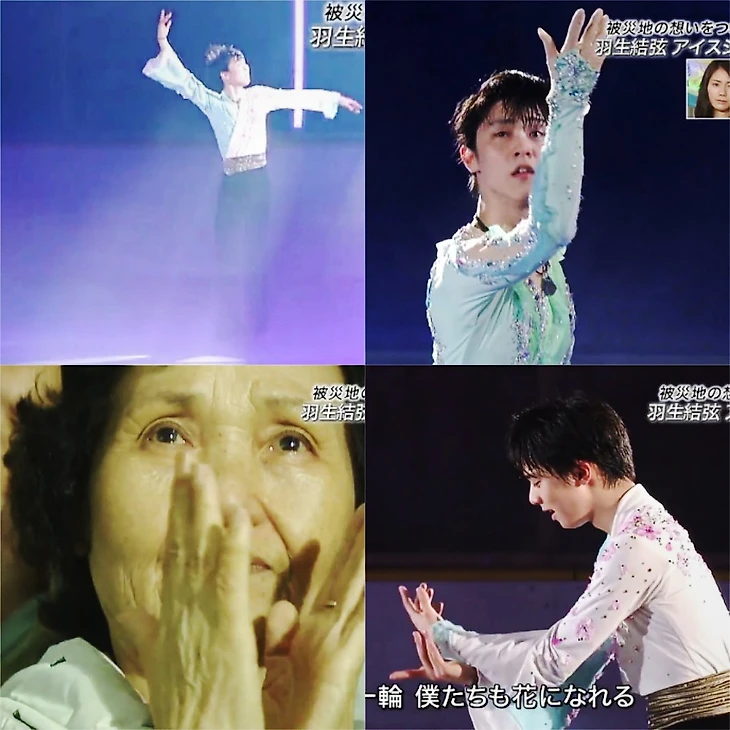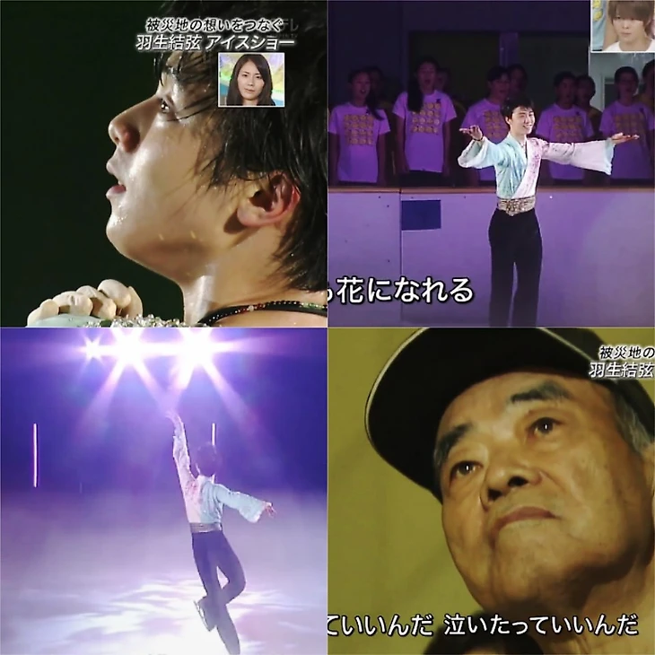 Юзуру организовал выступления для постарадавших от землетрясения людей. Он исполнил два показательных номера - "Реквием небес и земли" и "Hana ni nare" под живое пение. Исполнил эти программы очень чувственно и эмоционально, а зрители были в слезах.