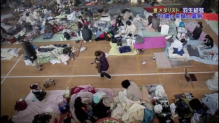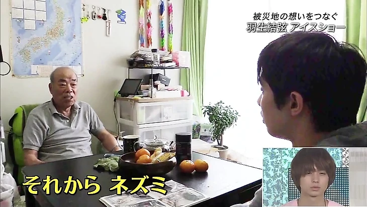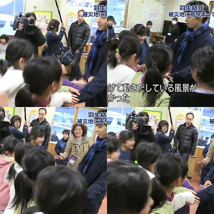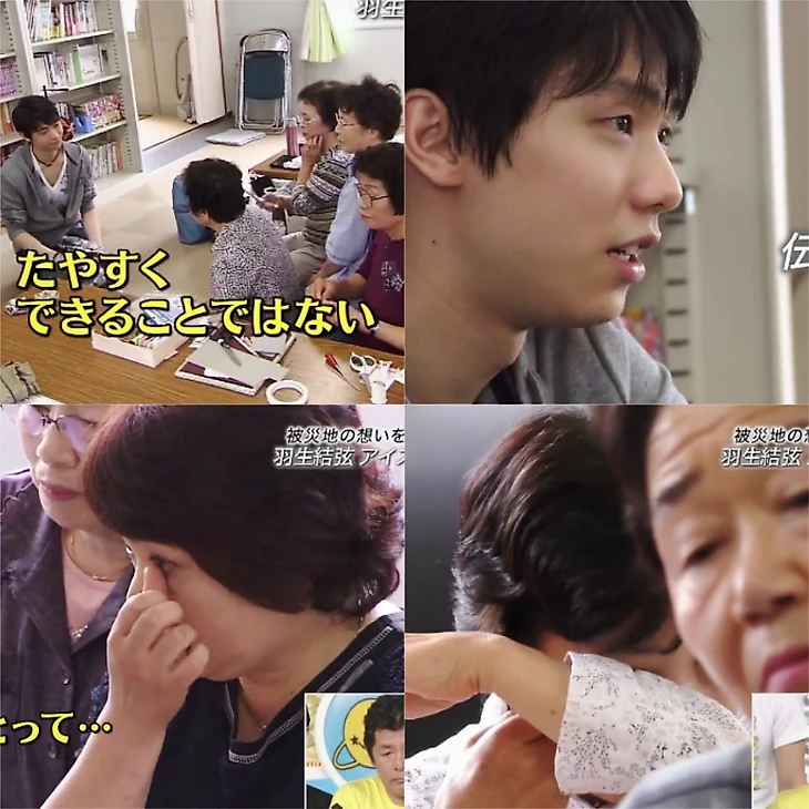 Затем Юзуру посетил другое место, швейную школу, где проживали люди, потерявшие свои дома. Одна из дам была тронута до слез и сказала: "Я не представляла, что я действительно увижу тебя здесь".