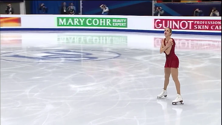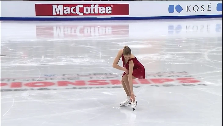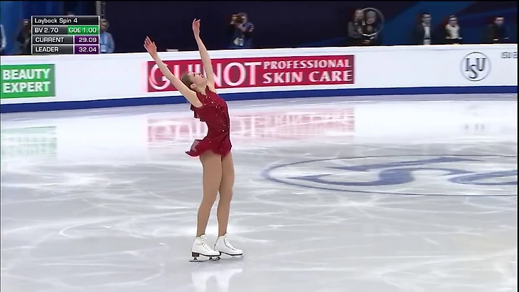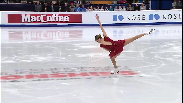 Эта заключительная мысль акцентируется в программе Каролины уже не отдельными жестами и позами, а прыжковым каскадом (флип-тулуп), окончание которого точно обозначает границу музыкальной мысли.