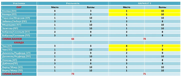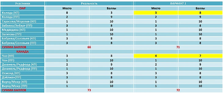 ВАРИАНТ 3: Коляда опережает всех в короткой программе, Чан отодвигается на 4 место. Тогда бы российские спортсмены опередили Канаду. Но с чего это все взяли, что Коляда должен был обогнать Шома Уно?