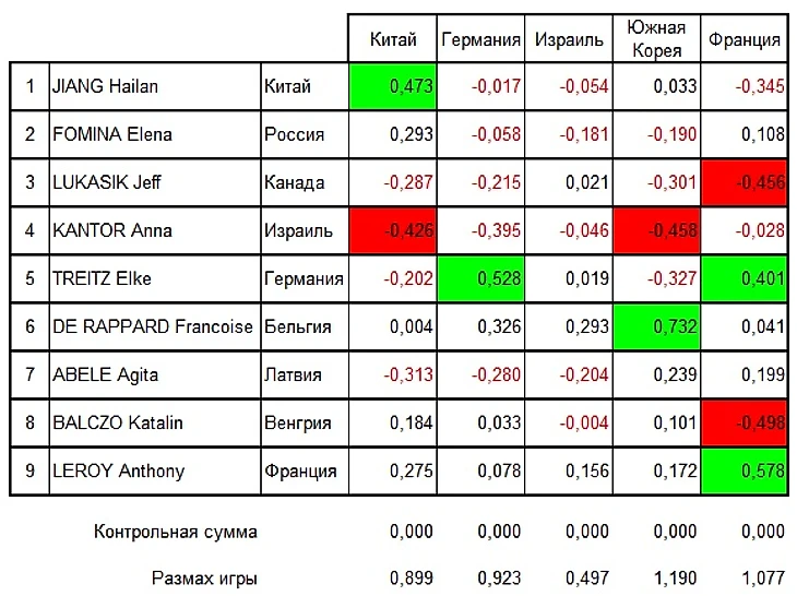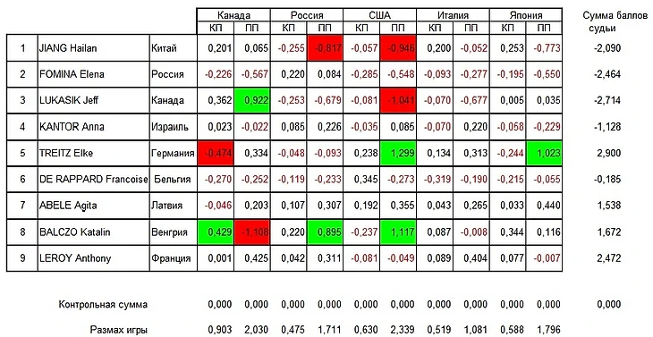В правой части таблички для 1-5 мест приведены суммы отклонений баллов для каждого судьи, сделанные им при судействе и КП и ПП. Сразу видно, кого из судей надо включать в бригаду судить предполагаемый рекордным прокат.