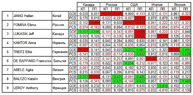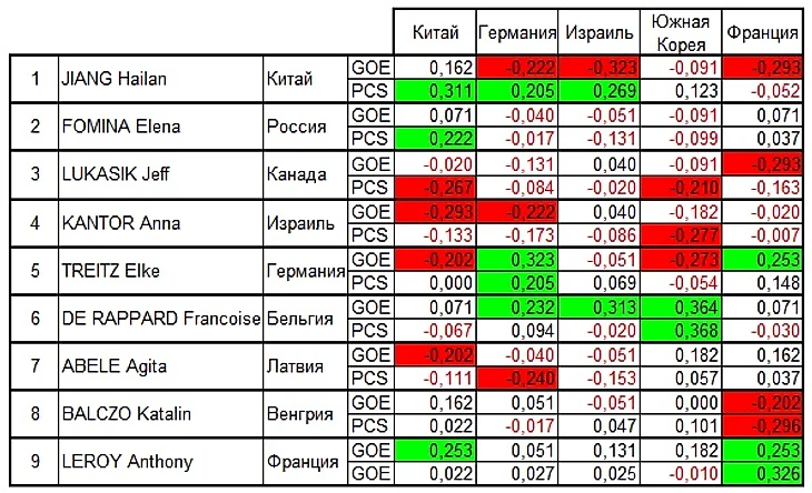 Многие судьи не стесняются в той или иной мере подсуживать своим фигуристкам - зеленый цвет клеток своей страны. Франция, Германия, Канада, Китай.