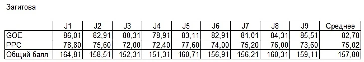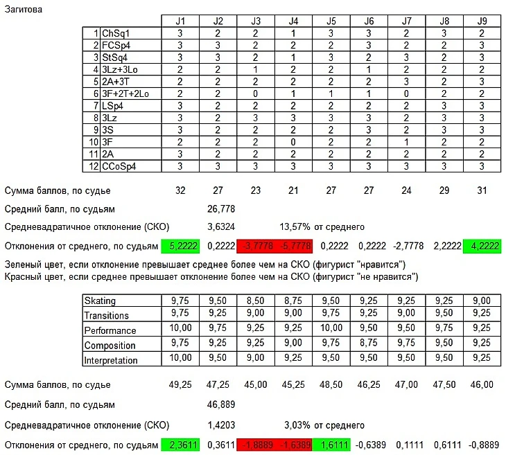 У Загитовой расчитал для каждого судьи GOE, PCS, общий балл, с допущением, что остальные судьи выставили бы такие же: