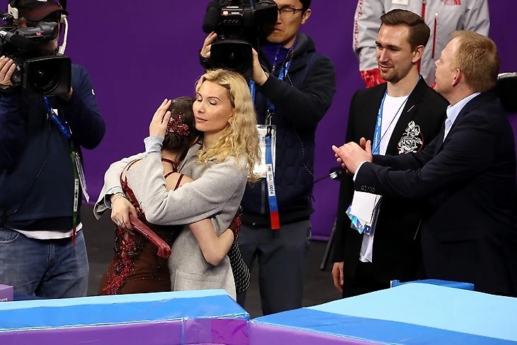 Затем Женя плакала на плечах у тренера Этери Тутберидзе, когда еще не знала оценок: