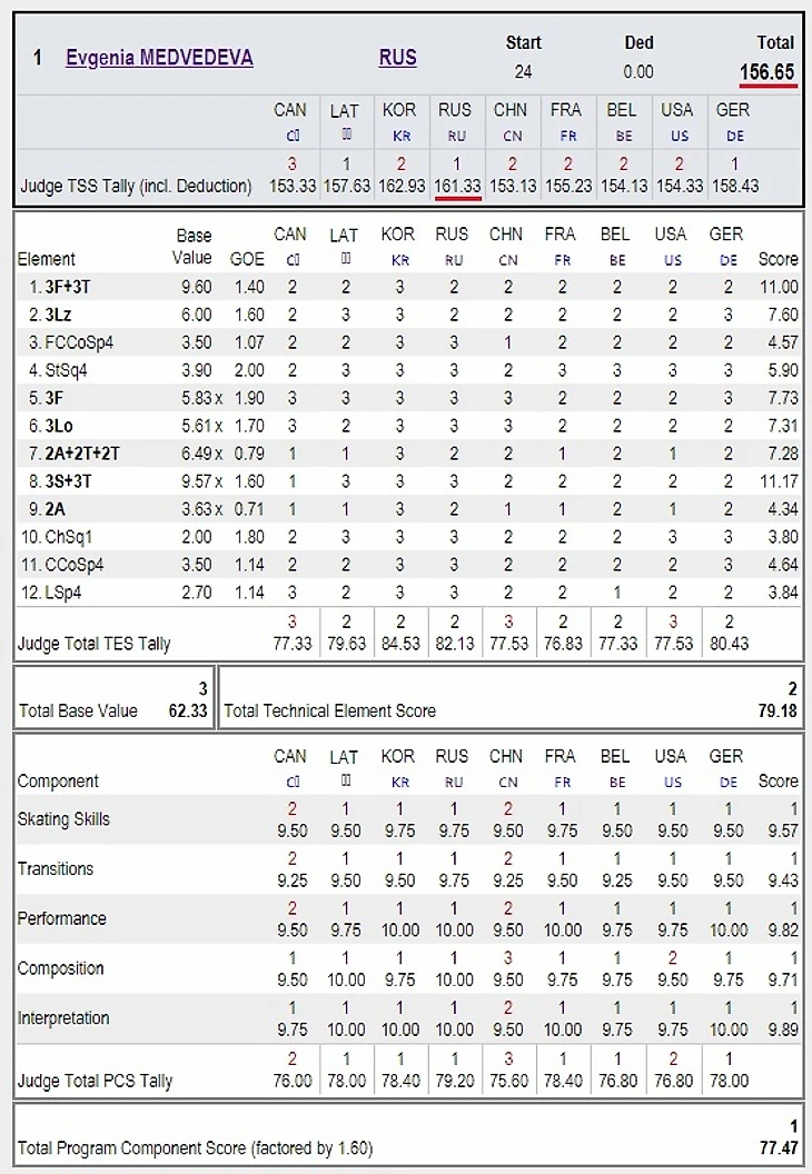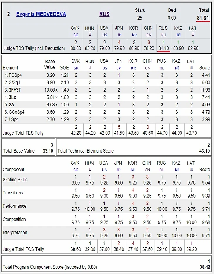 Колдовство заставило судей корректировать баллы GOE в меньшую сторону во время проката Алины. Если бы оценка ставилась на основе баллов, которые высвечивались сначала, то итоговая оценка Загитовой была бы у КП на 0,19 балла больше, у ПП - больше на 0,28. Яга заставила судей скорректировать GOE для главной соперницы Алины так, что ее итоговые GOE относительно начальных увеличились: КП на 0,51 балла, ПП на 0,26 балла.