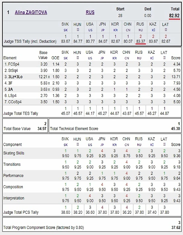 Коррекция GOE в ПП. У Алины уменьшилось на 1,17 балла, у главной соперницы возросло на 0,40.