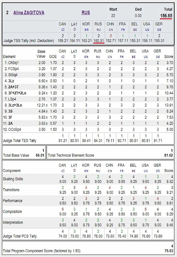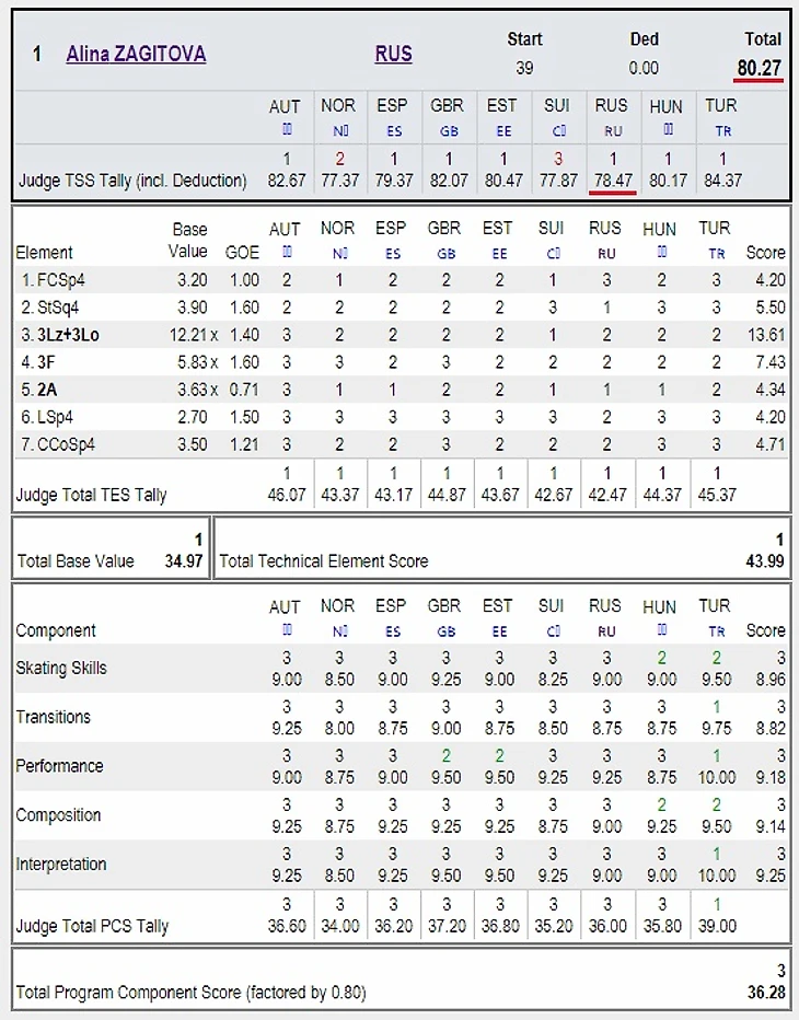 И околдовала Баба Яга на чемпионате Европы судейскую бригаду. Особенно сильно заколдовала она российского "судью" Юлию Андрееву, которая поставила Алине такие баллы, что оценка на основе её баллов была аж 78,47, на 1,8 балла меньше итоговой.