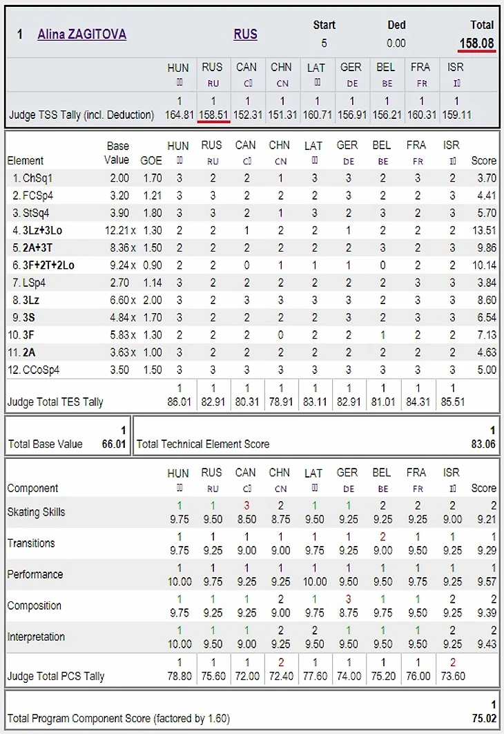 А для особо любопытных совет: можете сами посмотреть очень примечательный пример, как уменьшалась в ПП Алины GOE за лутц с 2,1 до 1,8. Да, видимо, совесть у кого-то из судей переборола колдовство и итоговое GOE за прыжок стало 1,9.