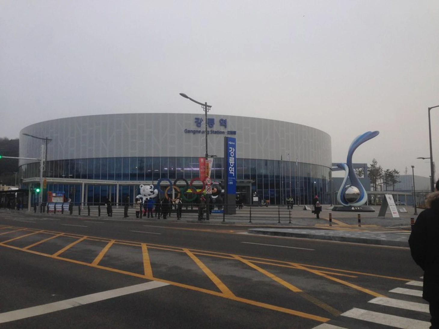 Благополучно встретившись и нафоткавшись с олимпийскими кольцами, мы сели на бесплатный шаттл-автобус до Ледовой арены Ганнына, к слову бесплатными были не только эти автобусы, но и весь общественный транспорт города на время ОИ.