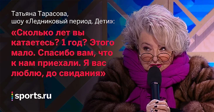 «Сколько лет вы катаетесь? Один год? Это видно. Этого мало. Спасибо вам большое, что к нам приехали. Я вас люблю, до свидания», – говорит Тарасова симпатичной паре в ярких костюмах.
