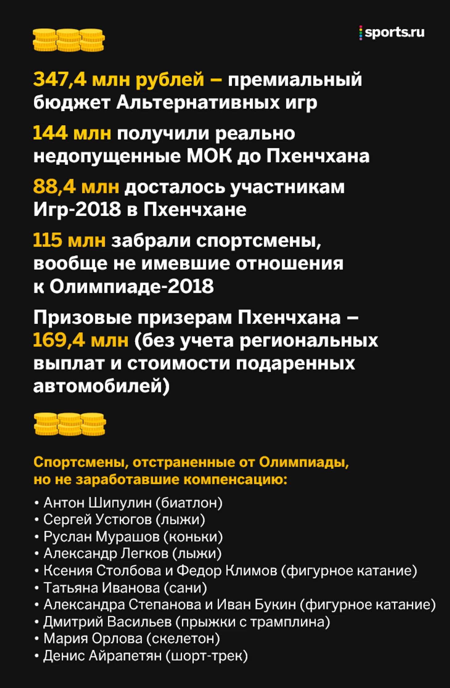 Уже по ходу соревнований вдруг выяснилось, что побеждают в них не только отстраненные от Пхенчхана. Треть премиального бюджета за медали Альтернативных игр освоили те, кто не имел к олимпийским санкциям против России никакого отношения – спортсмены второго эшелона, просто набравшие форму к концу сезона. А некоторые звезды (Устюгов, Шипулин, Мурашов, Легков) не заработали вообще ничего.