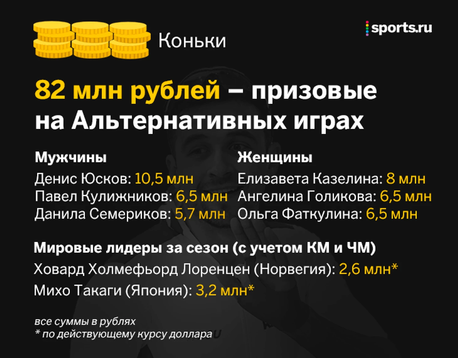 Биатлон, лыжи, коньки, шорт-трек, бобслей и скелетон – в этих видах спортсмены получили возможность хорошо заработать на отстранении от Игр. Цифры из распоряжения премьер-министра Медведева: 4 миллиона за победу, 2,5 – за второе место, 1,7 – за третье. Таких призовых чемпионаты России (им присвоили статус альтернативных стартов) еще не знали и вряд ли когда-то увидят снова.