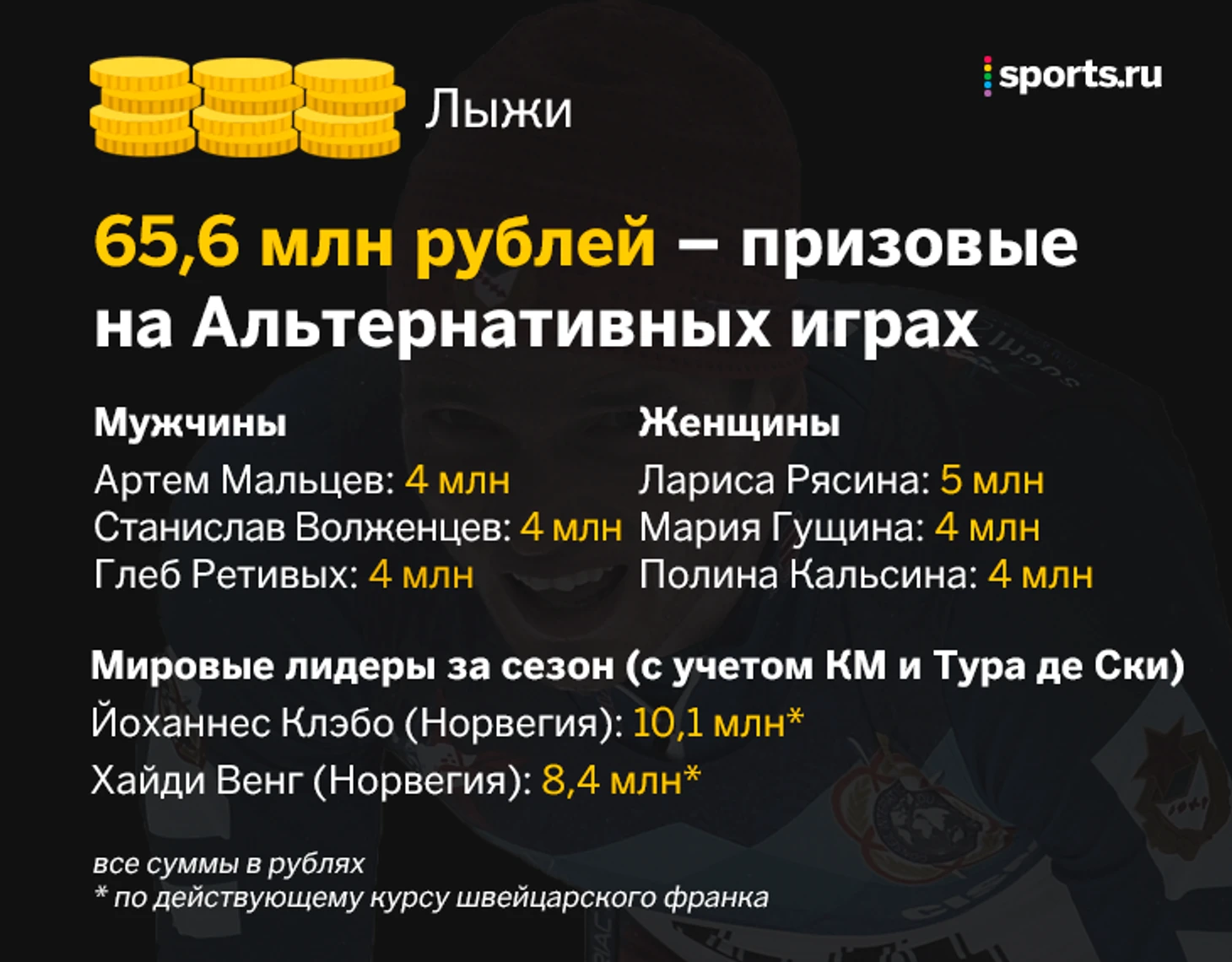 Лыжники распределили деньги равномерно – никто кроме Ларисы Рясиной не забегал в тройку больше одного раза. Зато отличился Сергей Устюгов, закончивший разделку 67-м в пяти минутах от чемпиона, а через три дня в паре с Александром Легковым выиграл командный спринт, который не входил в программу Альтернативных стартов и не поощрялся миллионами.
