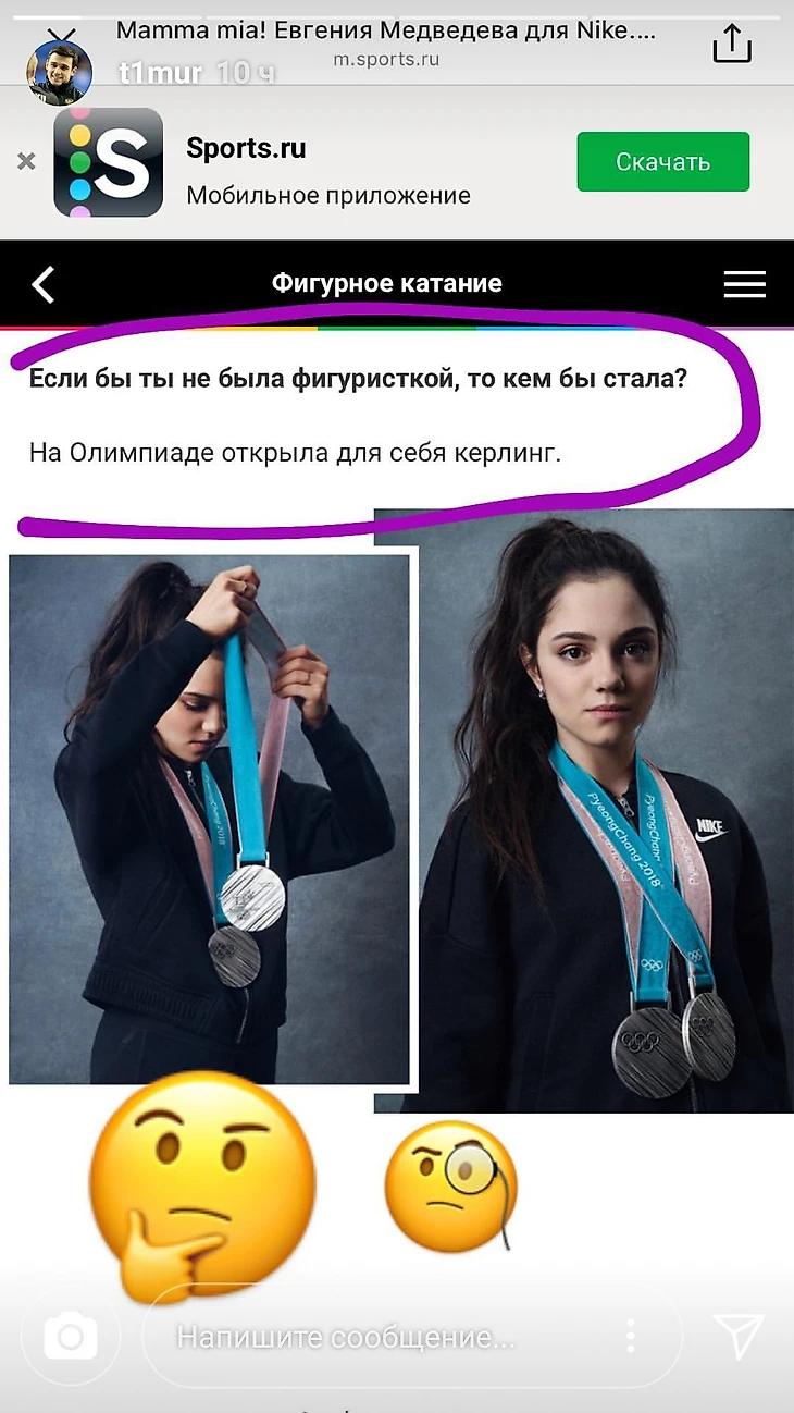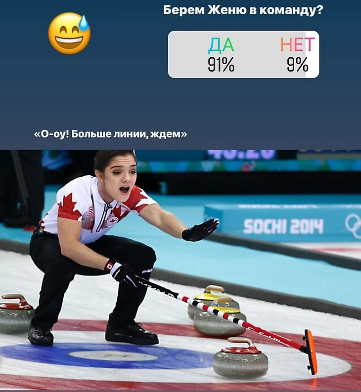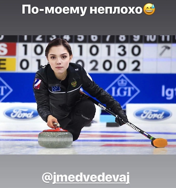 Евгения Медведева в интервью для Vogue рассказала, что могла бы заняться кёрлингом, если бы не выбрала фигурное катание. Член сборной России по кёрлингу Тимур Гаджиханов представил в своём Инстаграме, что из этого могло бы получиться.
