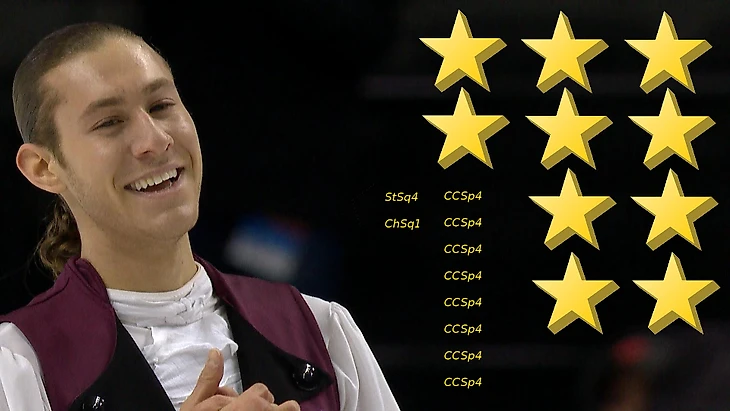 Так как в этот раз Мишан решил сделать ставку на ГОЕ, его потери чуть-чуть снизились и составили уже меньше девяти баллов. В том числе, потому что теперь из контента выброшен всего лишь 2А. Это все еще дофига, но как мы помним из предыдущего выпуска, его основные конкуренты - Шома и Натан - страдают от новых правил еще больше, поэтому здесь Коляда заимел серебро. Чен, хотя и потерял почти двадцатку, остался с золотом, все же 8 квадов это 8 квадов это 7 квадов по новой системе, но все еще дофига, а вот Уно пошел лесом.