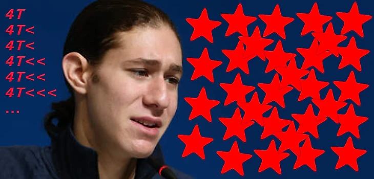 Здесь Джейсон был в хорошей форме, поэтому пошел на 4Т аж два раза, но по новым правилам существенные потери последовали только от того, который в КП - он был докручен и упаден, тогда как в ПП в точности наоборот - недокручен, но приземлен (итого по баллам 3.75 против 6.21, почувствуйте разницу). В конечном итоге, американец потерял шесть баллов.