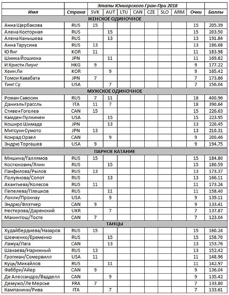 ЮНИОРСКАЯ СЕРИЯ ГРАН-ПРИ 2018. Лидеры по очкам за прошедшие этапы.