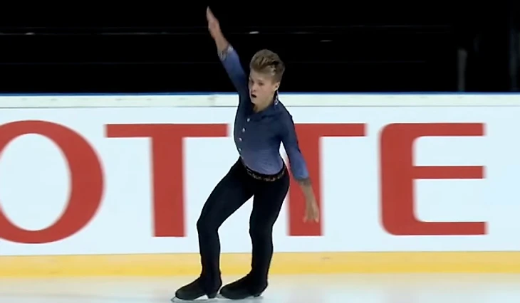 Наибольшие надежды затаил второй участник от России, Егор Мурашов — у пацана и третье место на этапе в прошлом году было. Но у госпожи Волчковой (она же Буцаева) довольно своенравные взгляды на постановки. Полюбуйтесь: марионетка в руках дилетанта. Тренер дергает за веревочку сзади, чтобы пацана повыше подкидывало на прыжках, но от этого только рубашка задирается на уши, как и в прошлом году. Что обидно — тройной аксель парень лучше всех исполнил, с таким выигрывать надо, а он 9ый. Ой, всё...