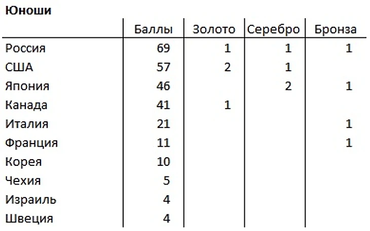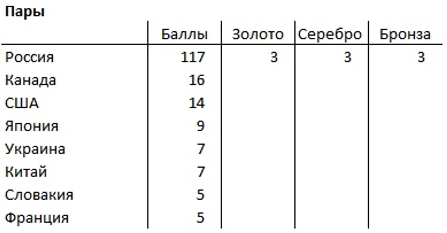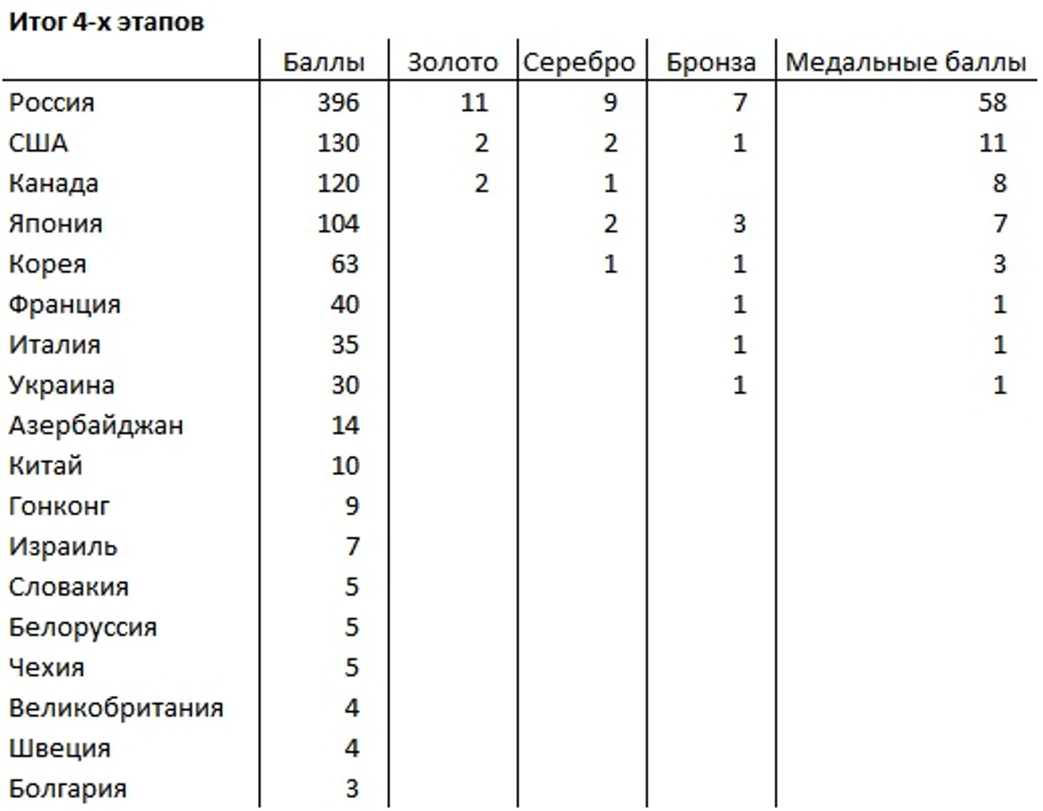 Решил немного посчитать: баллы и медали, заработанные фигуристами различных стран на прошедших этапах.