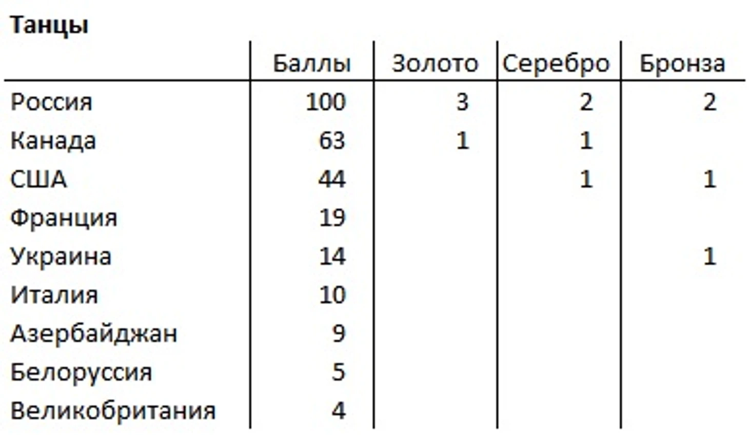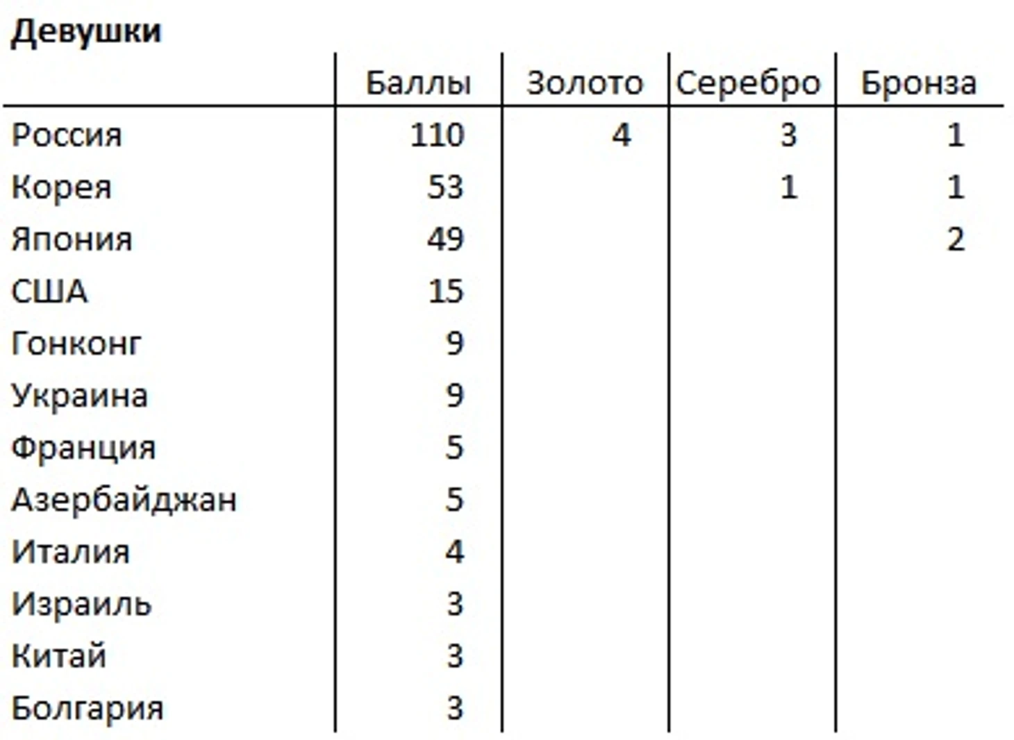 Медальные баллы посчитаны по стандартной схеме: 3 балла за золото, 2 - за серебро, 1 - бронза.