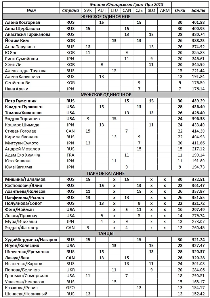 ЮНИОРСКАЯ СЕРИЯ ГРАН-ПРИ 2018. Лидеры по очкам за прошедшие этапы.