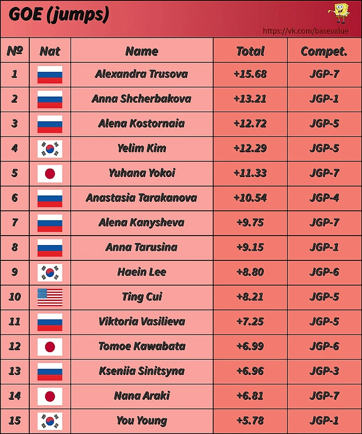 Вот так выглядит рейтинг плюсовых ГОЕ за прыжки по лучшему из двух этапов: