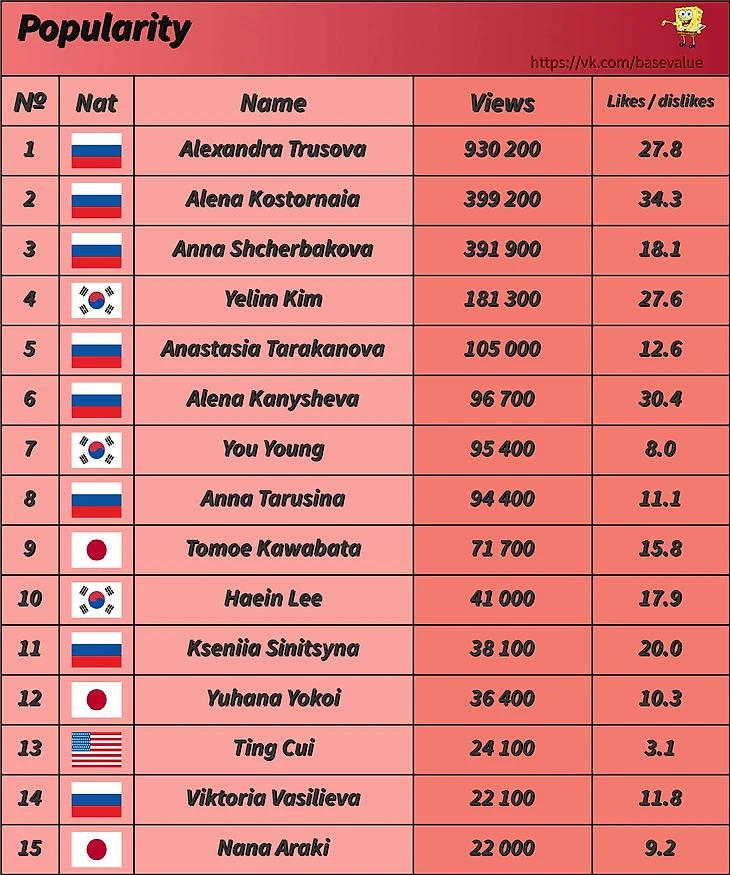 Интересно еще отметить, что самое лучшее соотношение по лайкам/дизлайкам вышло у Косторной - 34 к 1, это очень прилично. Это значит, что максимум только каждый 35-й имеет какие-то претензии к глейхонарезкам к катанию Алены, что при её относительной известности опять же весьма впечатляет.
