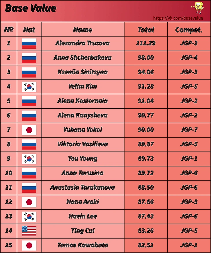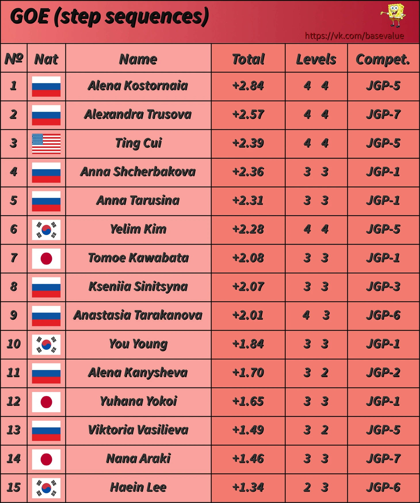 Мы всегда ориентируемся на высокие сизон-бесты, так же поступили и в этот раз - поэтому в обзор были включены все фигуристки, набравшие больше 180 баллов хотя бы на одном из двух этапов. Таким образом, сюда попали все россиянки (естественно, с такой-то конкуренцией) - Трусова, Щербакова, Косторная, Канышева, Тараканова, Тарусина, Синицына и Васильева. Первые пятеро по совместительству попали еще и в финал ЮГП. Три кореянки - уже относительно известные Ю Ён и Ким Э-Рим (она же Йе Лим Ким), и менее известная Хэ-Ин Ли (Haein Lee). Особенно, конечно, выделяется Э-Рим, отобравшаяся в финал первой кореянкой с 2005 (?) года. Сенсационно 180 баллов на ЮГП сумела преодолеть только одна японка - Юхана Йокои, да еще и в самый последний момент. Если еще 2-3 года назад японки с россиянками конкурировали почти на равных, обычно отбираясь в финал три-на-три, то теперь первые в перманентном подвале. Хотя, как все знают, все крутые японки сейчас во взрослых. В общем, чтобы статистика не выглядела совсем монохромно, чисто от себя мы добавили еще трех фигуристок с бестами за 170 - Нану Араки, Томое Кавабату и американку Тинг Цуй. Итого 15 фигуристок.