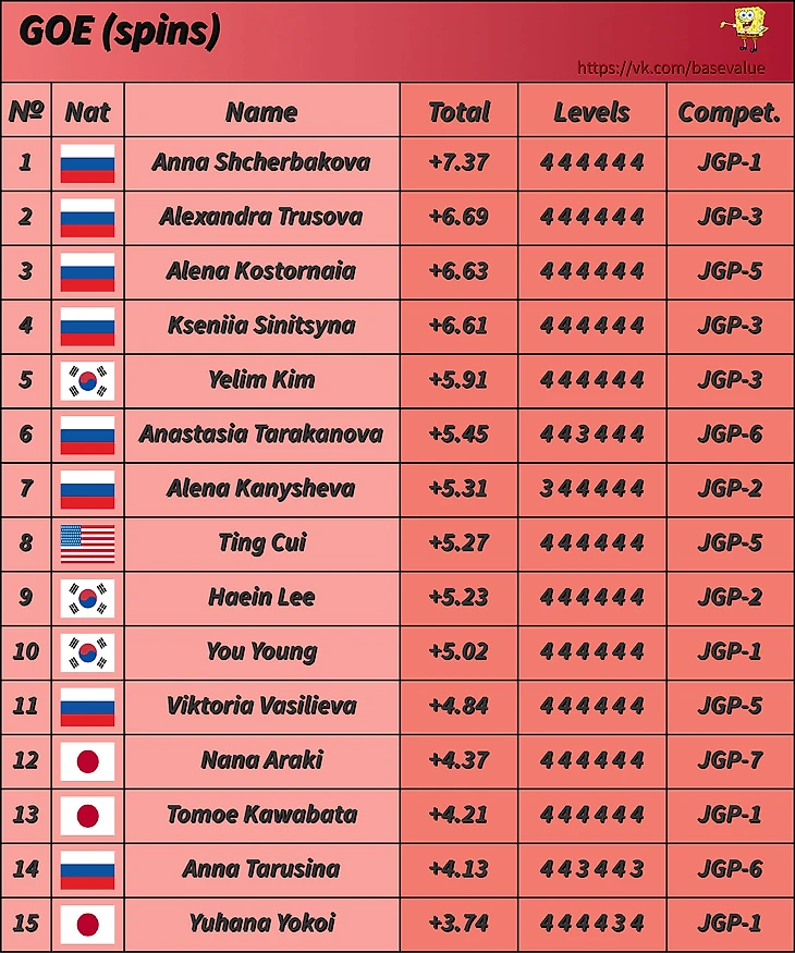 Никаких особых новшеств по части вращений новые правила не внесли. Разве что критерии обновились примерно по той же схеме, что и у прыжков. За шесть штук на две программы по-прежнему можно собрать до +7-8 баллов если ты Щербакова, Нугуманова или Валиева. И где-то +1-2 если ты Быченко или Алиев. Ничего личного.