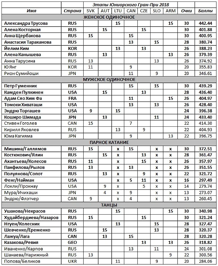 Вот и подошли к концу этапы юниорской серии Гран-При, а значит пришло время подвести промежуточные итоги и назвать тех, кто отобрался в Финал, который состоится с 6 по 9 декабря в Ванкувере, Канада.