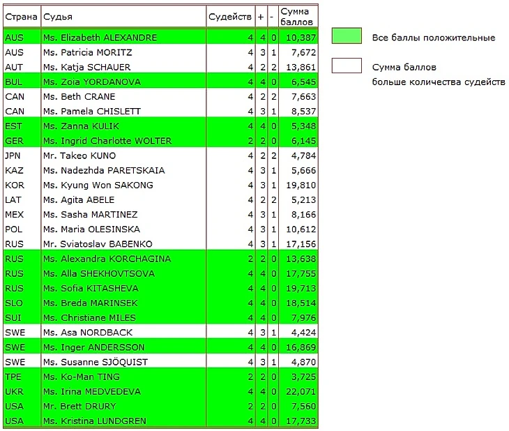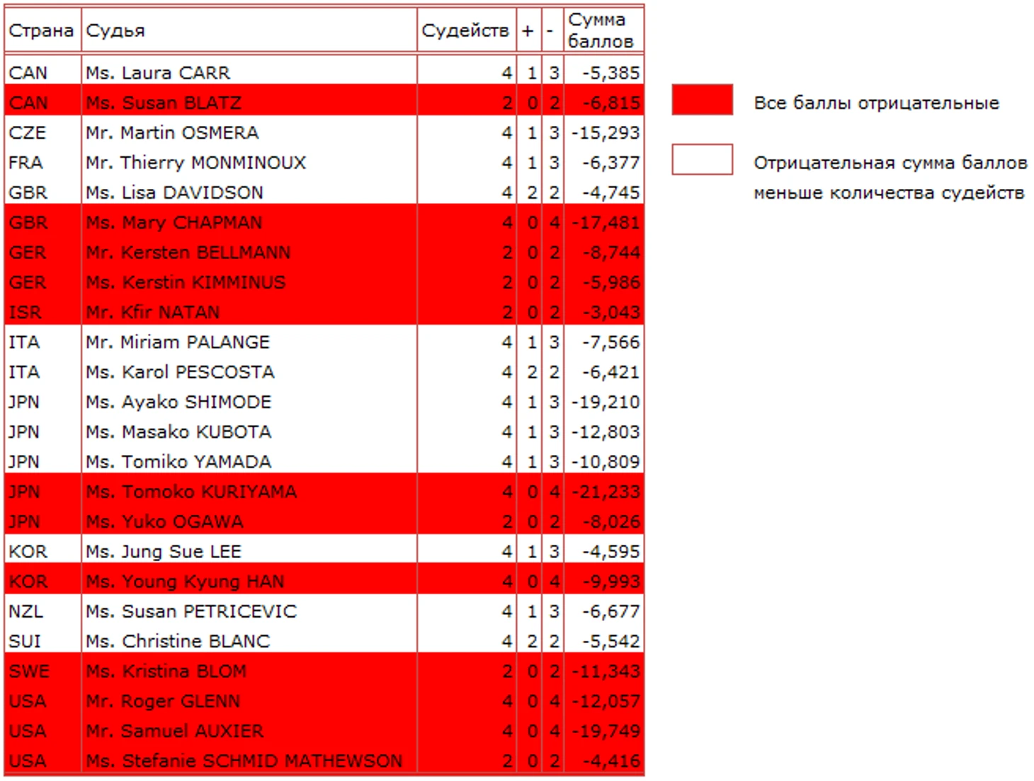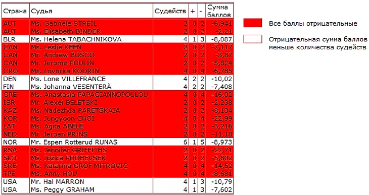 Далее в отдельные таблицы были сведены судьи с отрицательными суммами разниц баллов, и, аналогично с положительными. При этом были убраны данные о судьях, имевших по два судейства и имевших как положительную разницу баллов, так и отрицательную. Убраны данные о судьях с малой суммой баллов, по абсолютному значению меньших 4. Не затронуты данные о российских судьях. Не затронуты судьи с одинаковыми по знаку разницами баллов.