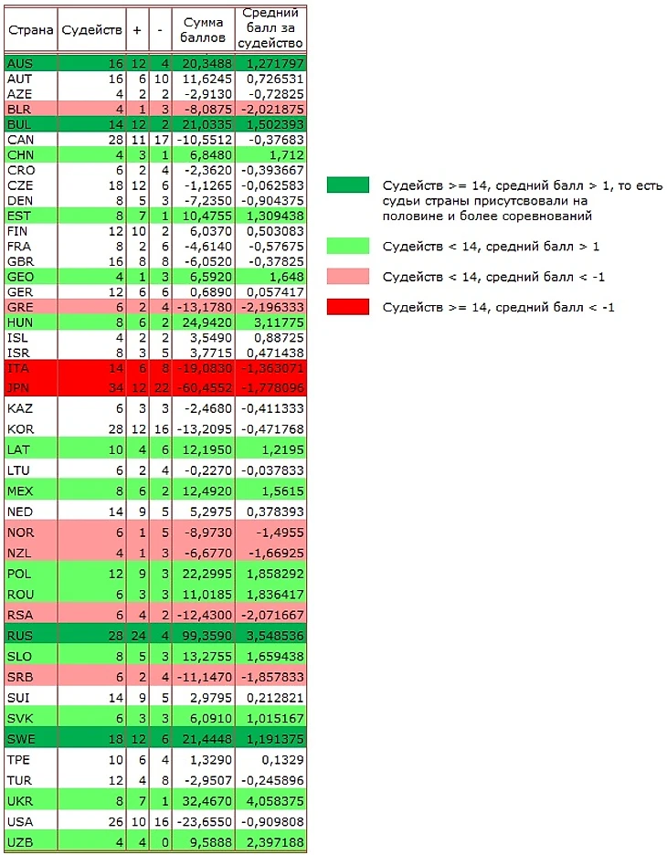 Ну и, наконец, в общей таблице для юношей и девушек сведена информация как судили наших спортсменов судьи той или иной страны.