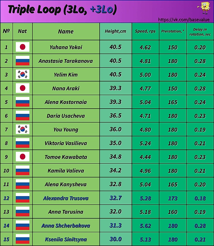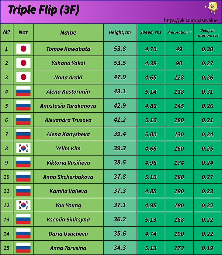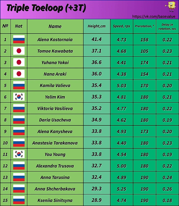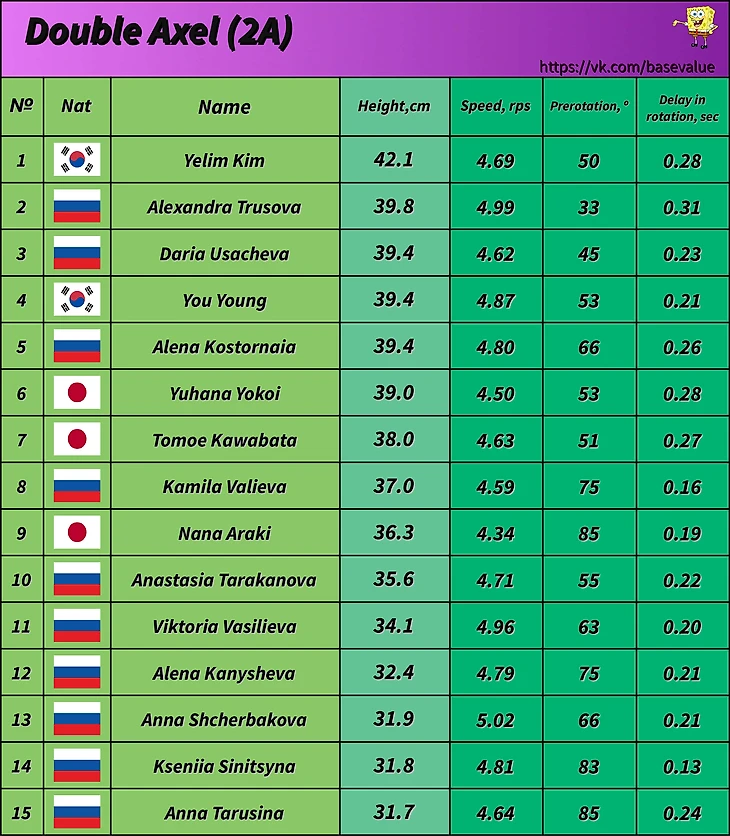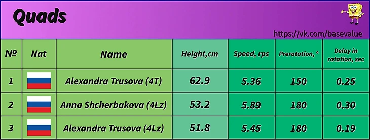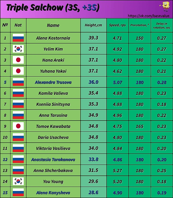 Таким образом, по таблице можно сделать вывод, что максимально оптимально прыгают Щербакова, Тарусина, Валиева, Васильева, Усачева и Ён - практически везде на тройных по пол-оборота.