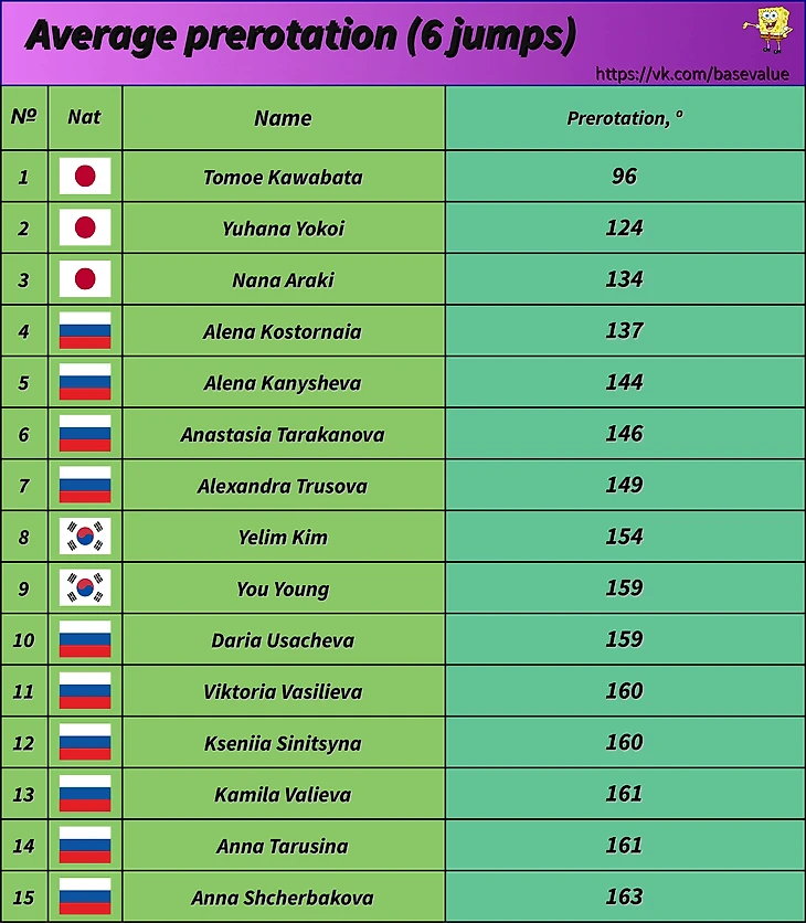И последний рейтинг, новый, но возможно дающий интересную интерпретацию того, как сегодня выглядит "оптимальная техника". Средний преротейшн - это тот самый параметр, по которому мы будем определять "читеров" (это шутка). То есть банально посчитаем сумму преров на шести основных прыжках и разделим на шесть. Чтобы вы понимали, средние показатели, скажем 45 градусов на акселе,180 на тулупе, сальхове и ритте, и 90 на флипе и лутце дадут итоговое среднее 128 (округленно) - это очень неплохой показатель по женским меркам.