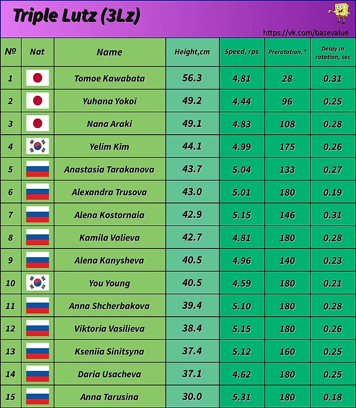 Ожидаемо все исполнительницы убойных риттовых каскадов остались на дне таблицы, но оно и понятно, по второй колонке видно насколько серьезные показатели скорости развиваются на этом прыжке, когда он следует за лутцем. Даже трудно представить, насколько еще серьезнее выглядели бы показатели крутки в случае третьего или четвертого 3Lo в каскаде.
