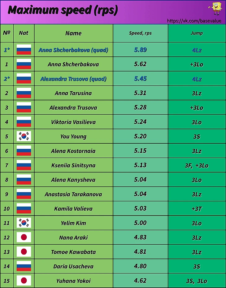 Ну а Аня Щербакова здесь вне конкуренции. Быстрее неё на текущий момент из известных мне фигуристов крутится только Гоголев.